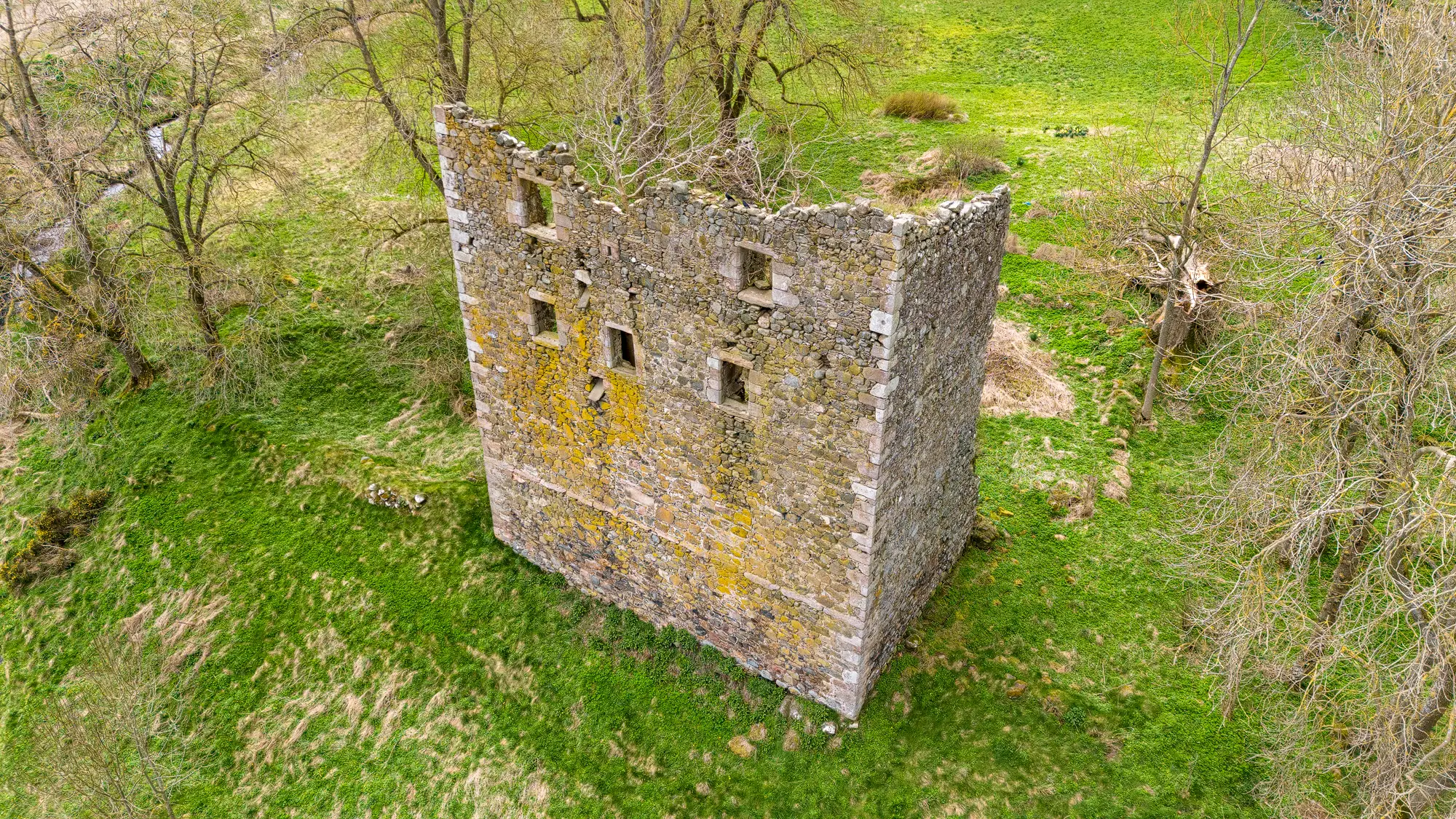 Looking at the site from high above, one can see the outline of a barmkin, a type of defensive enclosure typical of this type of tower house during medieval times.
