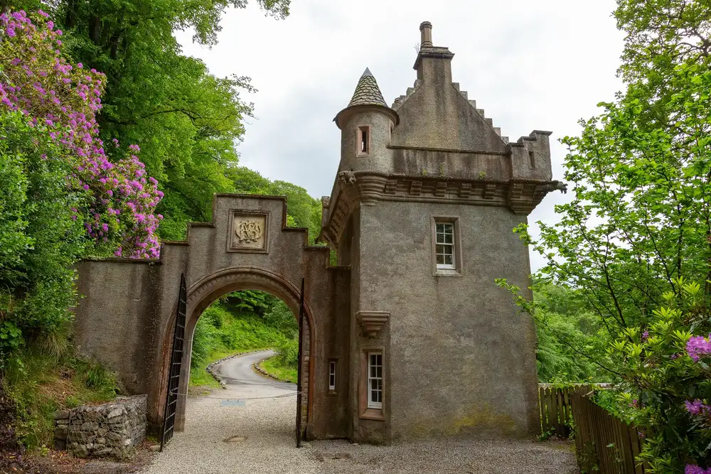 At the north east end of the bridge, a fairy-tale-like gatehouse stands by the entrance to the castle grounds. The Baronial-style gatehouse is a 3-storeyed building with a conical tower at the SW corner. The gatehouse and arch were designed by architect Thomas Mackenzie. Above the arch, the Macpherson-Grant coat of arms and the family motto can be seen: Touch not the cat bot a glove.