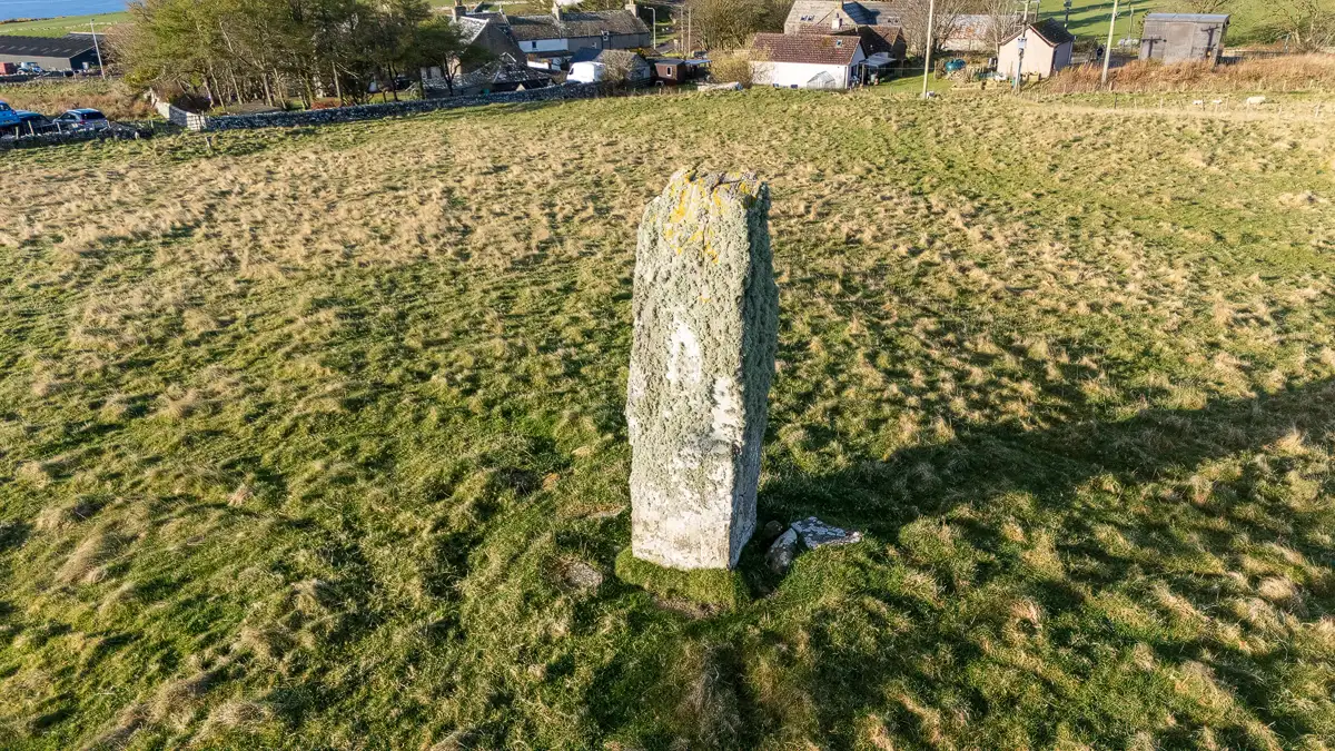 Buldoo Standing Stone is one of those sites that rewards the detour. It’s not the most accessible or well-signposted ancient monument in Scotland, and the lack of formal access means you need to be prepared to view it from the roadside or, as we did, send a drone up for a closer look. But the stone itself is magnificent – nearly four metres of sandstone that has stood in this field for five millennia, quietly overlooking the village of Latheron and the Caithness coast beyond. If you’re driving the A9 through this part of the Highlands, it’s well worth a stop.