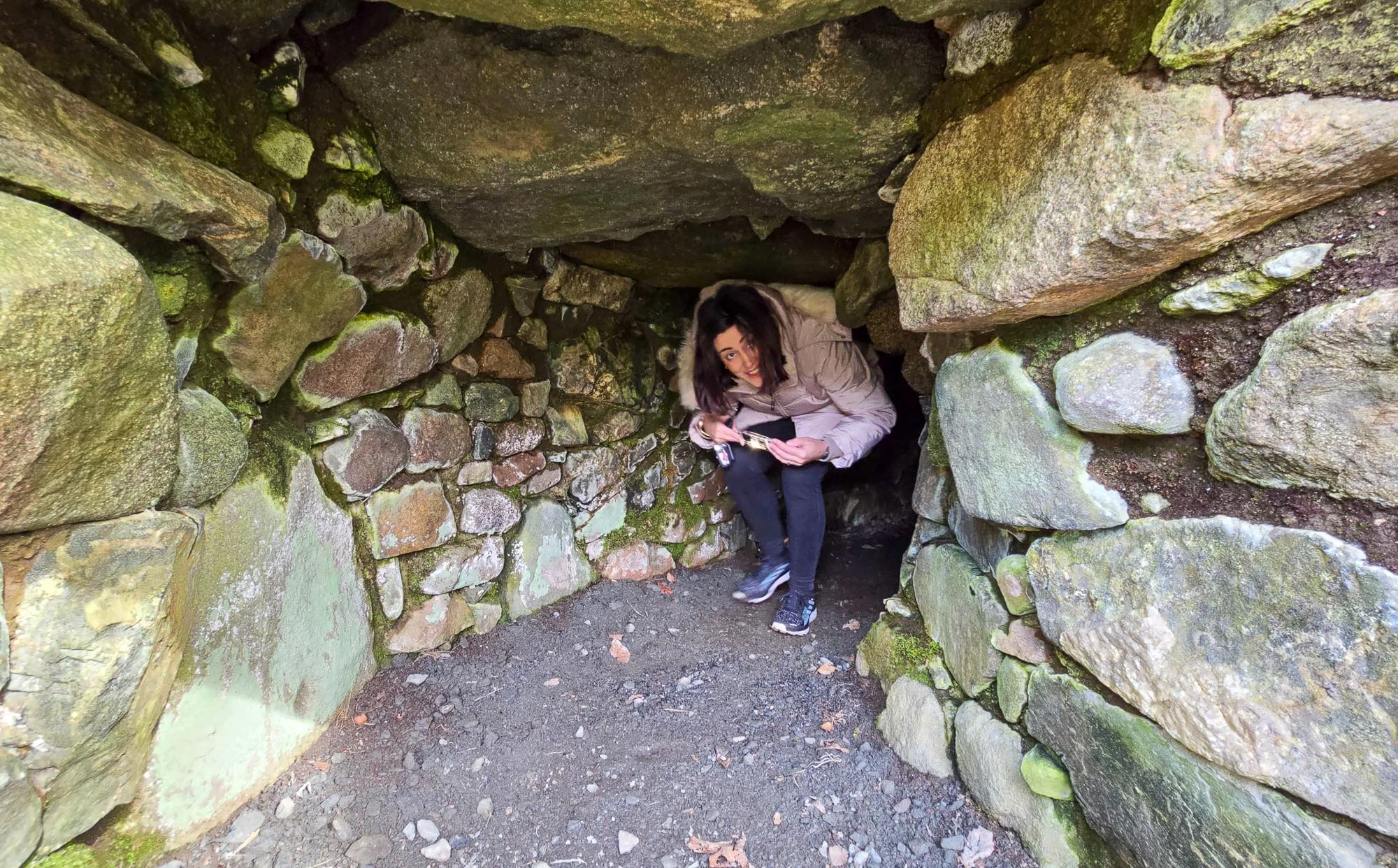 The entrance itself is a low, stone-capped opening set into the hillside. You need to crouch down – and in places practically crawl – to get inside, which immediately adds to the sense of adventure. I’d strongly recommend bringing a torch; the light from your phone works perfectly well. Within a few feet of the entrance, daylight disappears completely and you’re relying entirely on whatever you’ve brought with you.