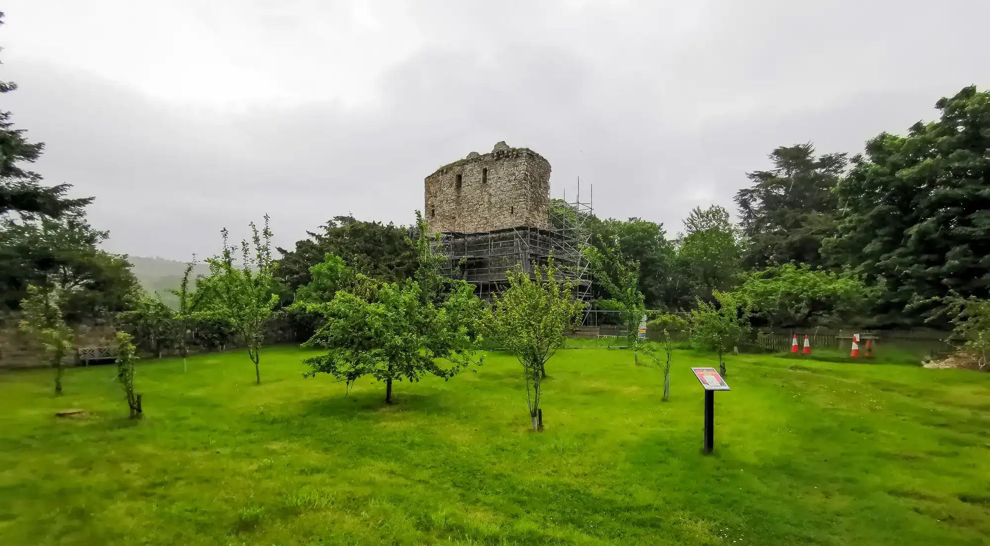 The path led us to the old walled kitchen garden, a well-kept space with cut grass and small trees. You can get a nice view of the castle here in the corner of the garden; there was a large temporary perimeter fence blocking access to the castle.