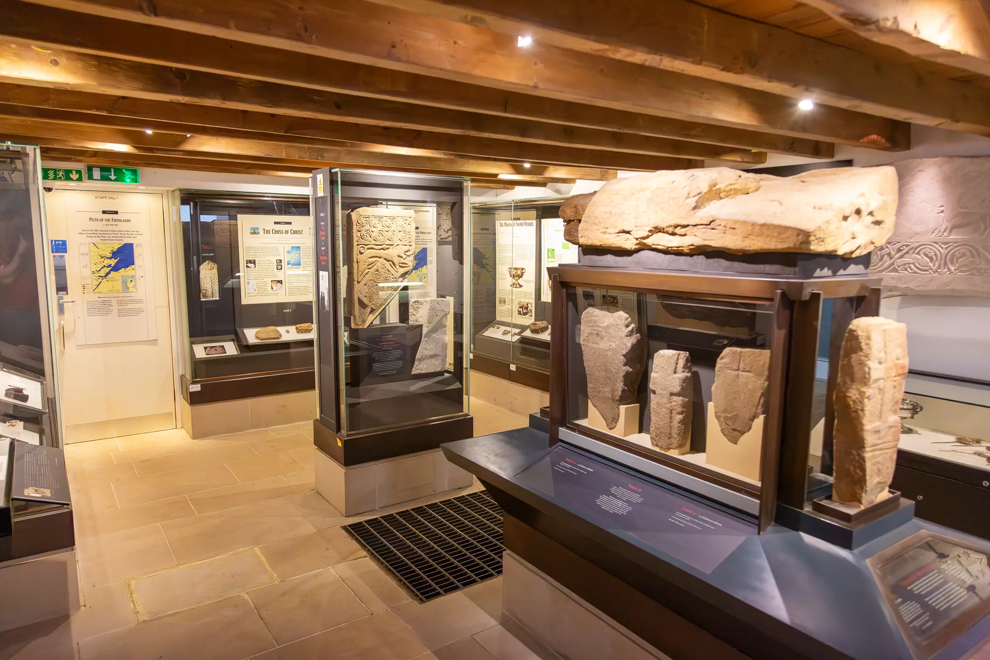 The "Pictish Treasury" is rich with sculptural fragments and complete pieces, including a striking array of animals, mythical creatures, and complex geometric designs typical of Pictish art. Notably, the Treasury also houses tools from Europe's only known vellum workshop, which was once dedicated to creating pages for illuminated manuscripts. Additionally, the Centre showcases tools and artefacts used to craft ecclesiastical items from metal, glass, and enamel. Visitors can also view replicas of a Viking hoard, including silver armlets and coins, buried in the churchyard around AD 1000.