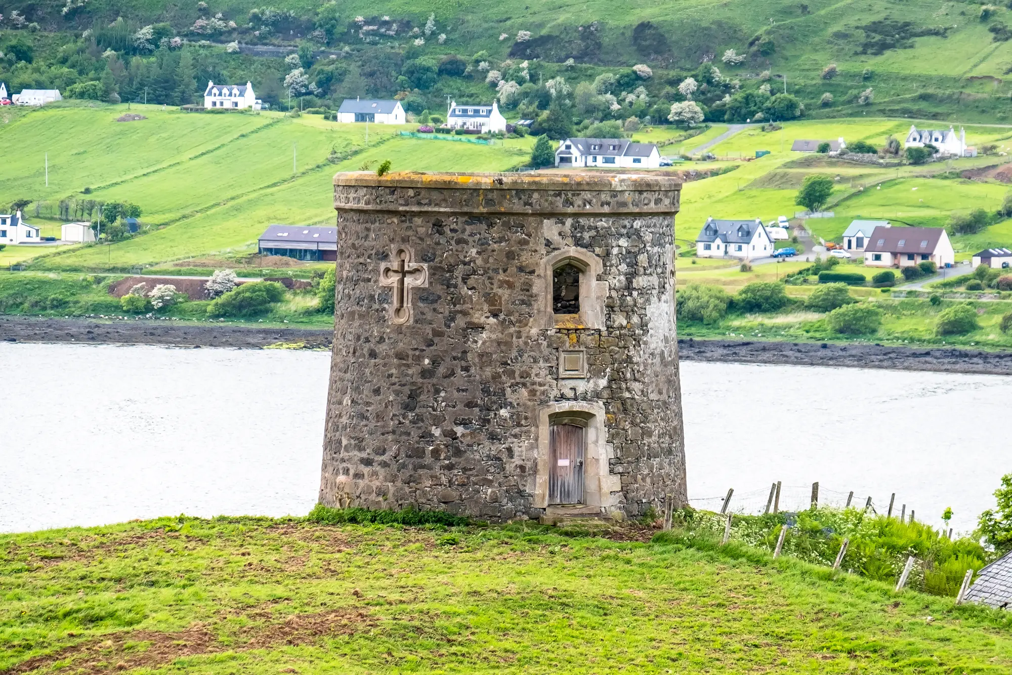 Uig Tower is a grand nineteenth-century folly, a two-storey structure that boasts a Romanesque design and narrow lancet windows arranged in a cross shape. Despite its appearance as a typical Norman round tower, it served no military purpose and was purely built for decorative purposes, showcasing the wealth and status of Major Fraser.